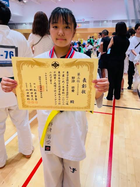 《彼女も予想通りの実力を発揮して初戦、準々決勝戦を勝ち上がった。準決勝戦は強豪との互角の攻防の末に惜しくも上段による技ありを重ねられはしたものの、日々の絶対的な稽古量に裏付けされたフィジカルの強さとスタミナと、試合に向けた自信を兼ね備えた素晴らしい戦いぶりで勝ち上がり、見事に東日本大会での第3位入賞となった。勝負度胸も人一倍にある。素直に話を聞ける性格と、厳しい稽古に耐えられる精神力と頑丈な体の強さもある。明るい性格で日頃からリーダーシップもある。空手を通じて、将来に役立つ強靭な心身を身に付けて貰えたと思い接している。ここから本当に更に強くなるだけで今のまま続けたら間違いがない。》