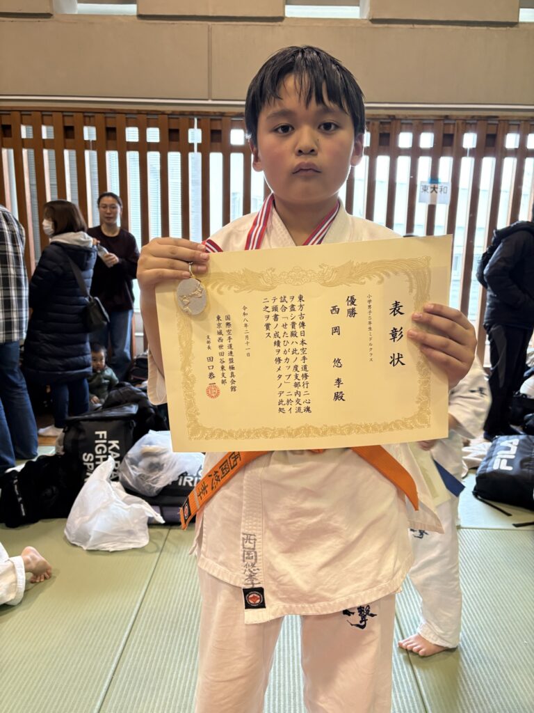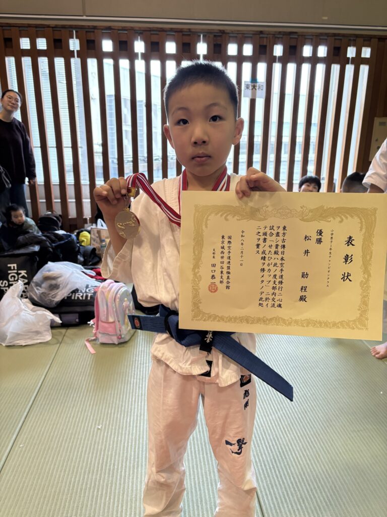 ◎組手試合には2大会目の出場となり、昨年は初出場のチャレンジクラスで初優勝。今大会はミドルクラスにレベルを上げての優勝になる。真面目な性格と日々の豊富な稽古量により、最近では技術力もパワーも更にアップしてきていた。年内にはチャンピオンクラスでの優勝も目指せると思う。