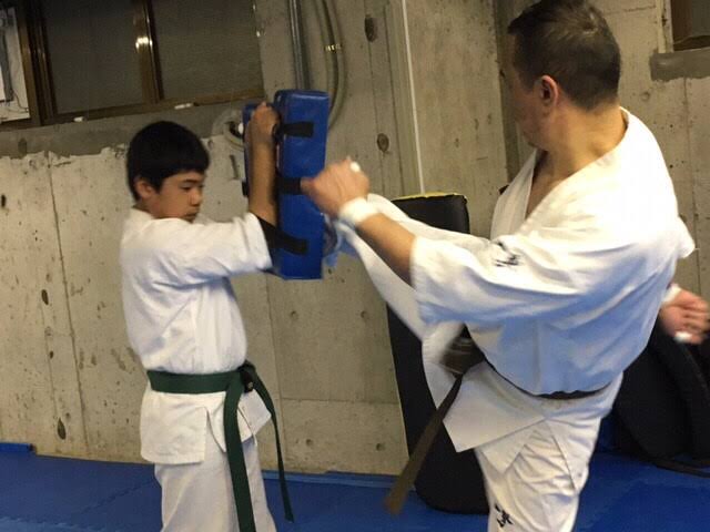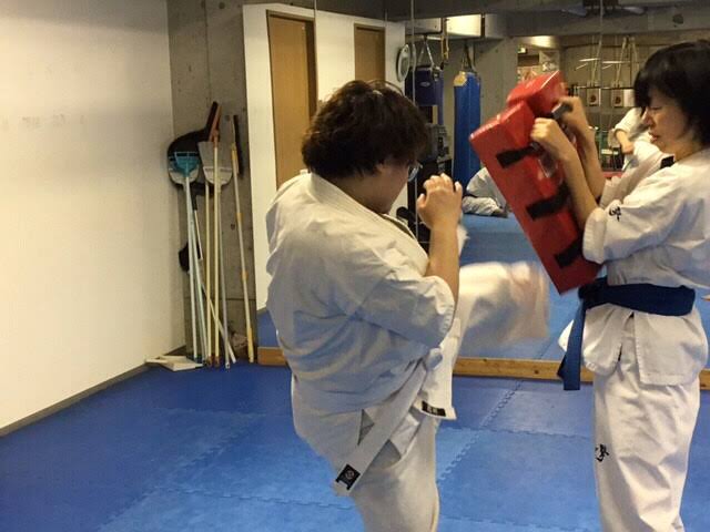 礼法、立ち方、基本、移動稽古、ミット稽古を最初のクラスで。(ミット稽古では4種類の蹴り技を行いながら蹴り込み)