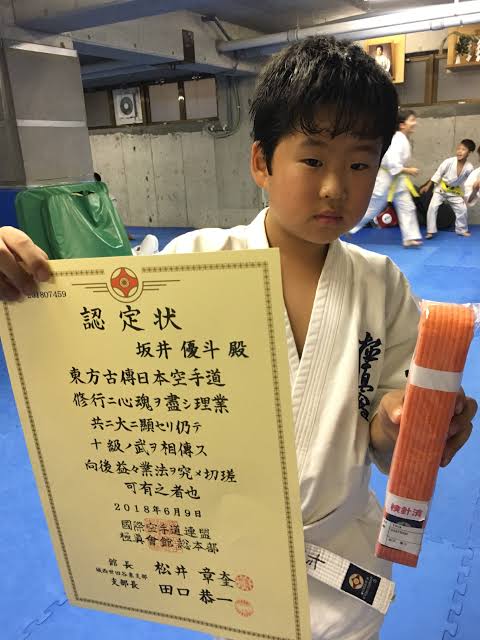 オレンジ帯(10級審査)に合格した坂井優斗君。(小学4年生)