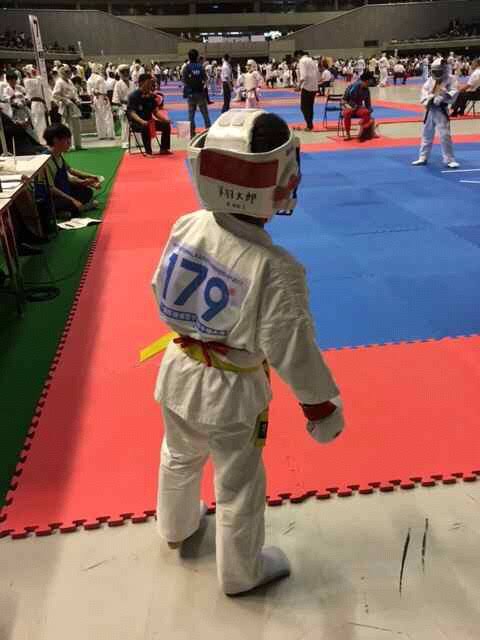 荒井翔大郎【2017西東京都大会第3位・2017支部内特選クラス第3位】の初戦、茶色帯の選手を相手に序盤から打ち合う。 (国際大会初出場)