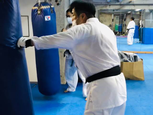 立ち方、基本稽古、フィジカルトレーニング、サンドバッグ稽古までを全員で行った。