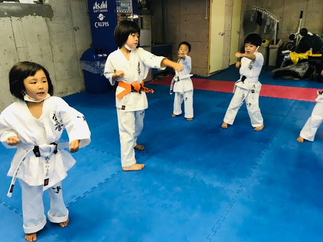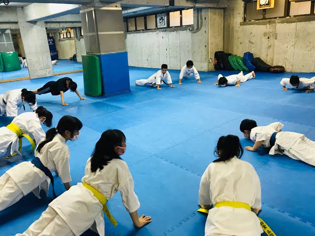 最初のクラスでは、基本稽古(突き技、受け技、手刀技)を重点的に全員が全力で。