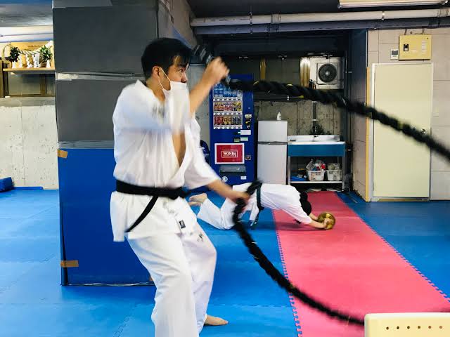 入念にストレッチをしてから、縄跳び、補強稽古、シャドー、ロープトレーニングから開始。
