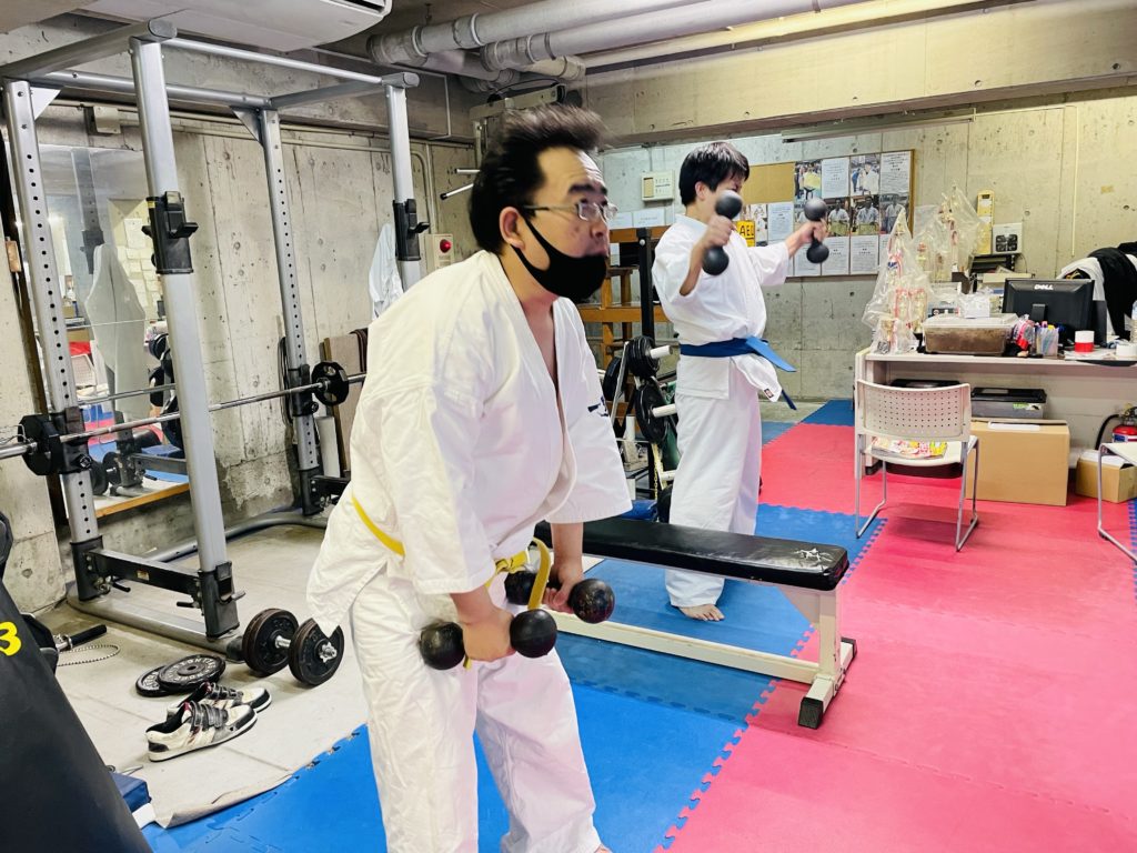 補強稽古の後は、対人稽古の受け返し、スパーリング、組手稽古を全員で。