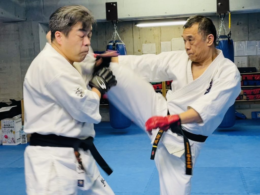 対人稽古のスパーリング、組手稽古では、変則的な技術をスパイスとして加えながら。