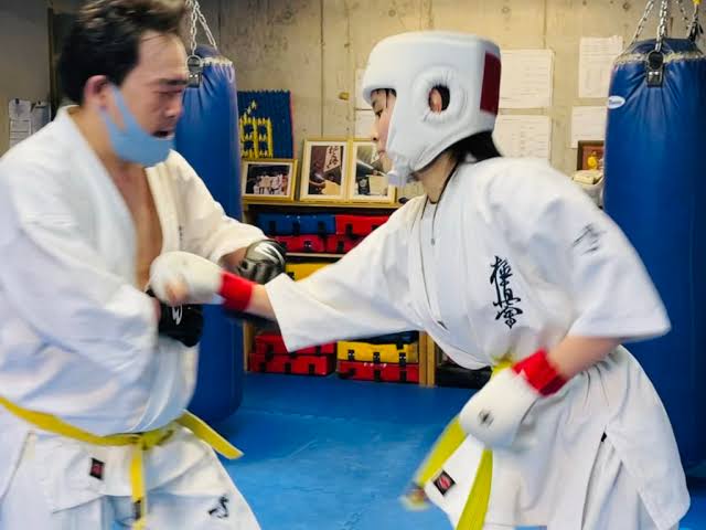 高校生以上の競技ルールを取り入れたスパーリング、組手を繰り返して、ラストはサンドバッグ稽古まで。