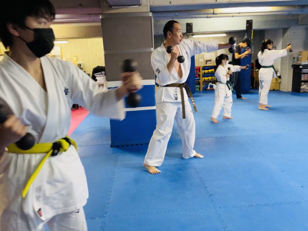 鉄アレイを使用した突き技のコンビネーションを反復。