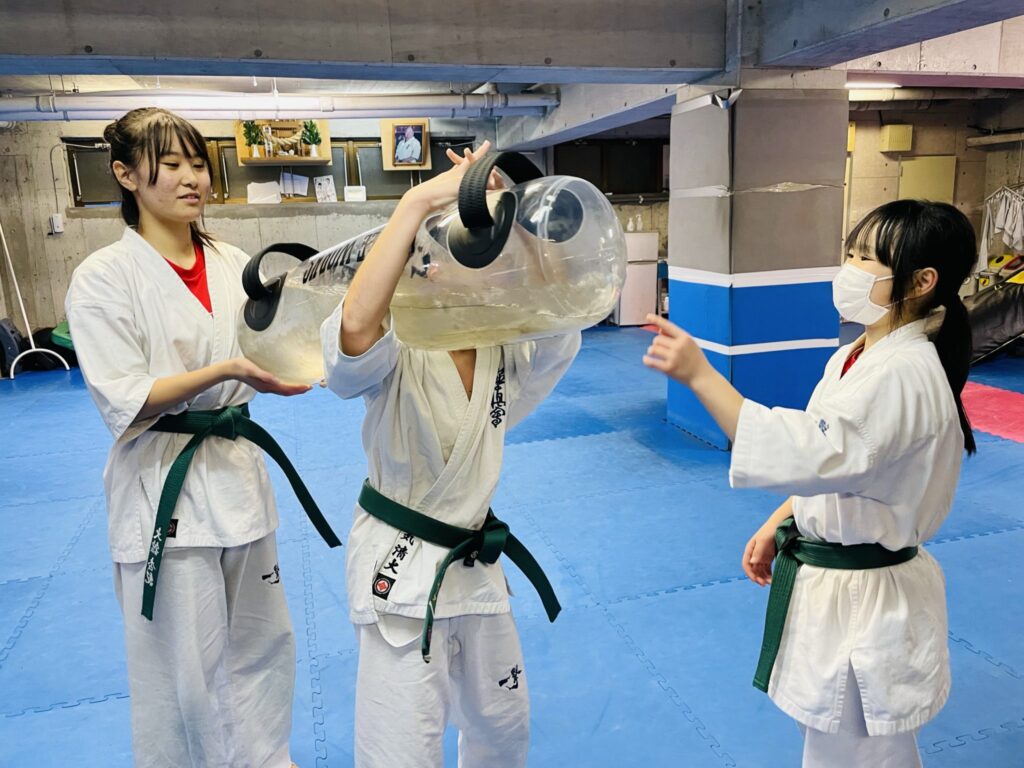 ウォーターバッグ、鉄アレイを使って、フィジカル強化トレーニング数種目をセット数を組んで。
