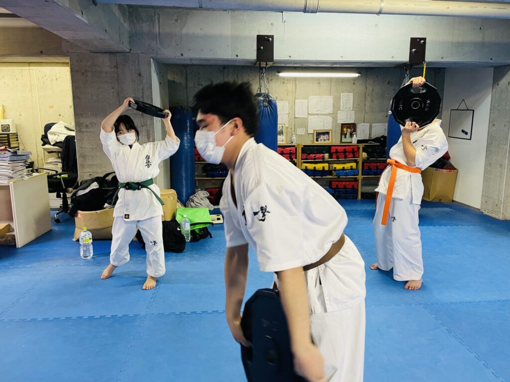 準備体操、基本稽古、フィジカルトレーニング、サンドバッグ、ミット稽古までを全員で。