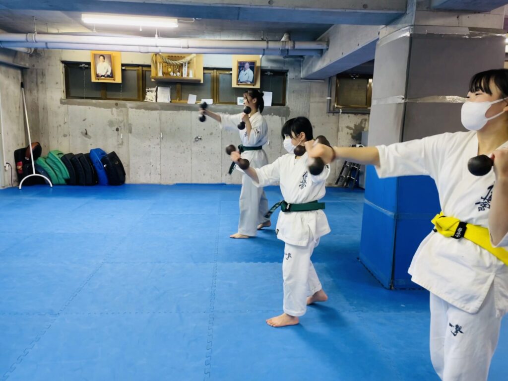 対人稽古や、シャドー、ダンベルを使用して、フィジカル強化の為の突き技のコンビネーションの反復稽古、ミット稽古での蹴り込み、移動、型稽古、補強稽古までを全員で。