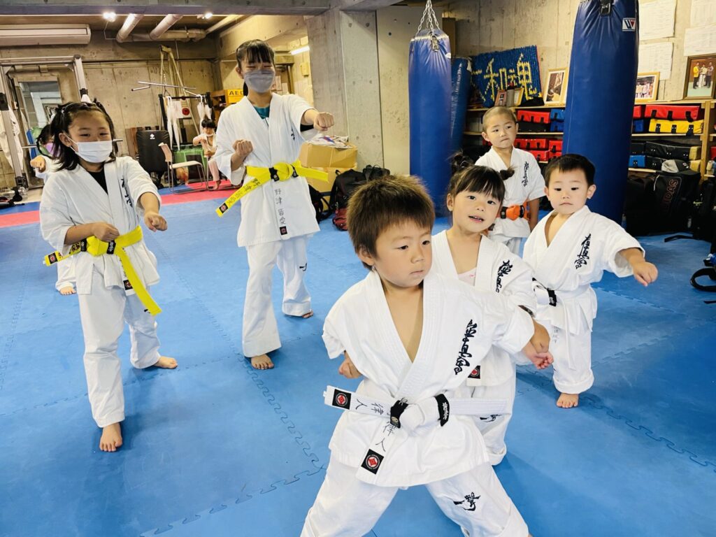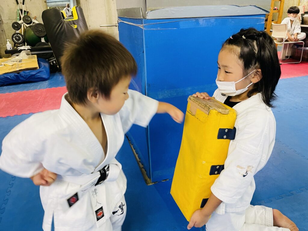 先輩達が真剣に稽古をする姿を見て、幼年部の後輩達もそれを真似する。