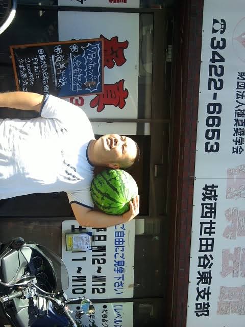 写真は指導員型研修と職員ミーティングを終えて、巨大なスイカを抱える佐野先生です。