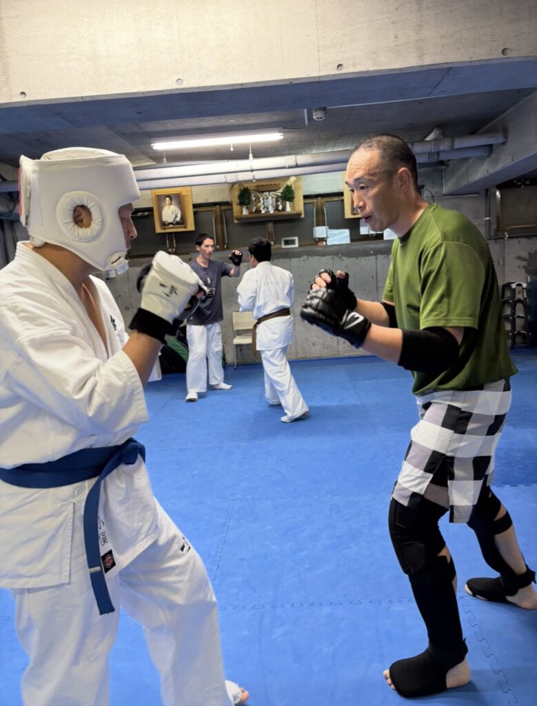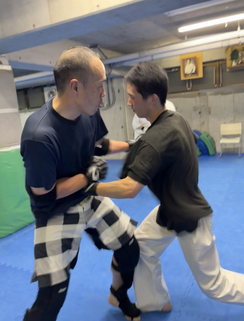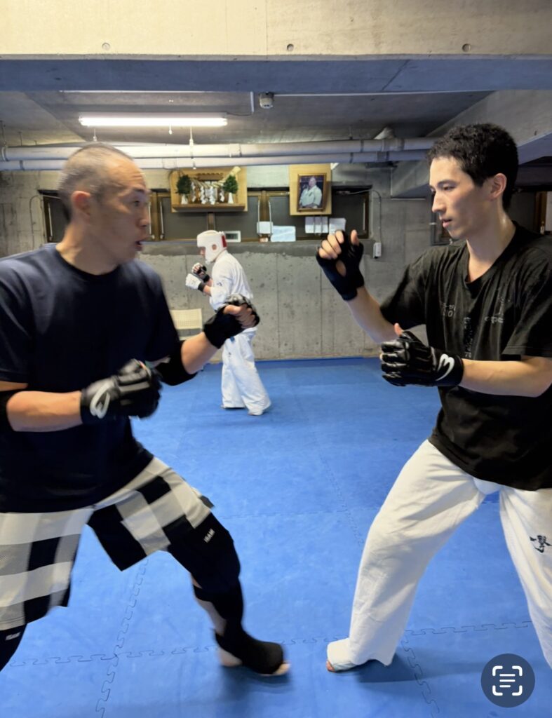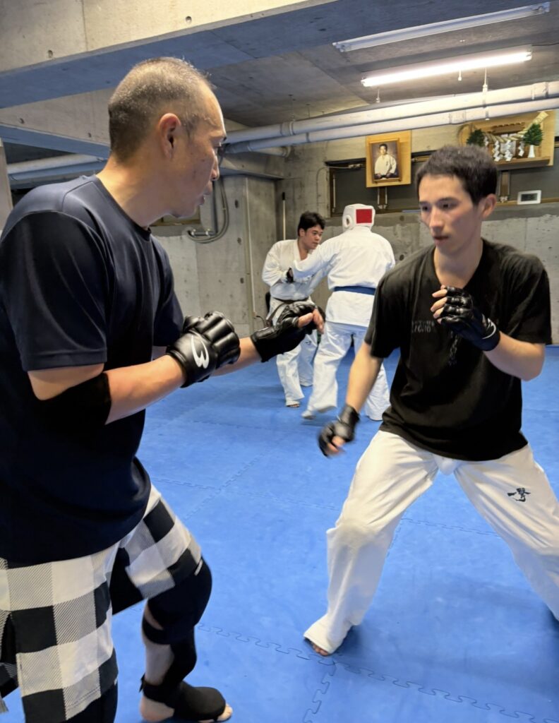 打撃の組手稽古、打たせ稽古、グラップリング練習(組み技、投げ技、寝技)、ウエイトトレーニング、補強稽古、サンドバッグの打ち込みまでを全員で3時間ほど行った。
